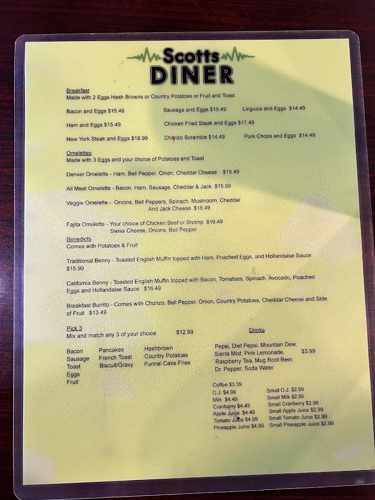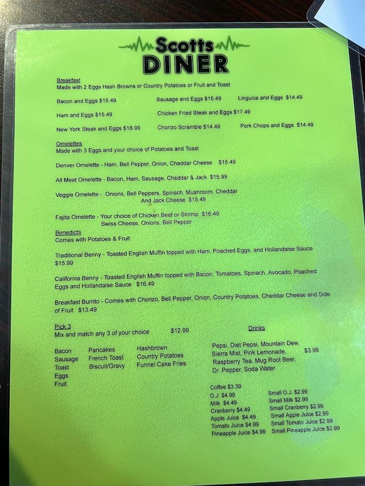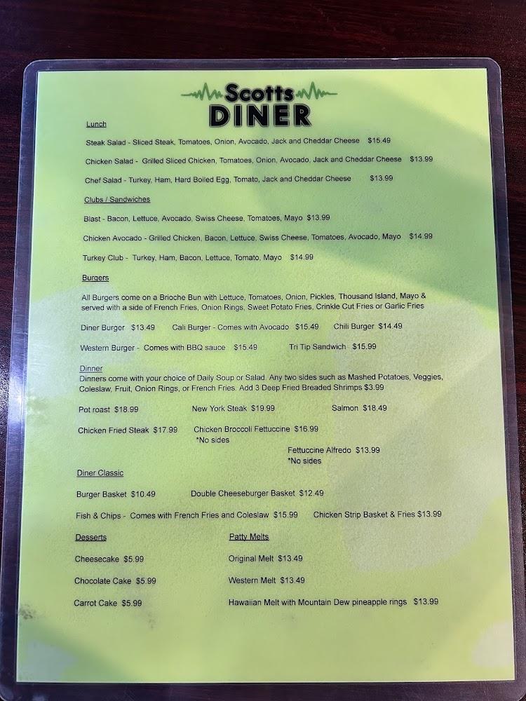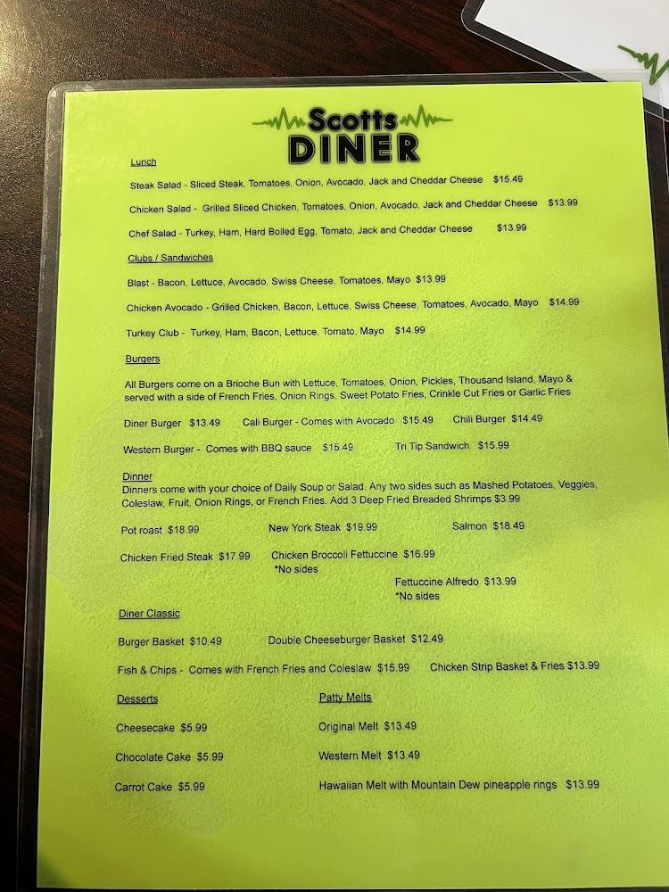 The menu at Scotts Diner reflects classic diner cuisine. Breakfast favorites include omelets and pancakes. For lunch and dinner, tantalizing options like the club sandwich and hamburgers take center stage. Portions are generous, ensuring satisfaction with every bite.